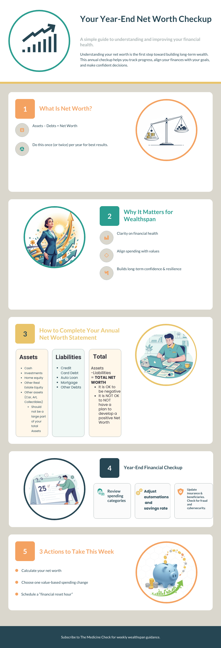 After documenting your net worth, completing a financial checkup ensures that the coming year begins with clarity and confidence. Review your spending categories, savings automations, emergency fund balance, and investment contributions. Then assess your risk protection—insurance, cybersecurity, fraud protection, and beneficiary updates. Together, the net worth statement + annual checkup create the most effective ritual to improve financial stability, reduce stress, and enhance your wealthspan over time.